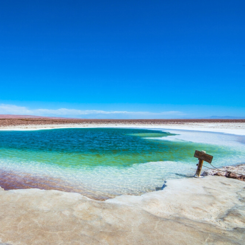 Even more to explore: The nearby salt flats at San Pedro de Atacama are known more for white sand than flowers. However, they offer the most unexpected swimming. Dive into the seven naturally- occurring hidden lagoons. Known as Lagunas Escondidas de Baltinache, the turquoise waters can turn an Instagram fantasy into reality. One hour away from here, you can discover a different kind of spring… Relax your muscles in the hot springs Termas de Puritama with up to 87-degree Fahrenheit geothermal mineral water.